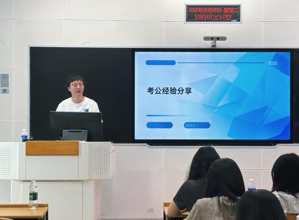 随后,22级金融学研究生陈有荣为同学们带来了考公经验的分享。他结合自身备考经历,提出“根据能力和要求选择合适岗位”的重要性。陈有荣详细分析了不同地域省考时间的差异,建议同学们可以合理规划,参加多次考试以提高成功率。此外,他还对比了事业编与公务员岗位的特点,帮助同学们更清晰地认识不同岗位的优劣势。在问答环节中,同学们踊跃提问,陈有荣耐心解答了关于报考岗位选择、备考时间安排以及如何调整备考心态等问题。