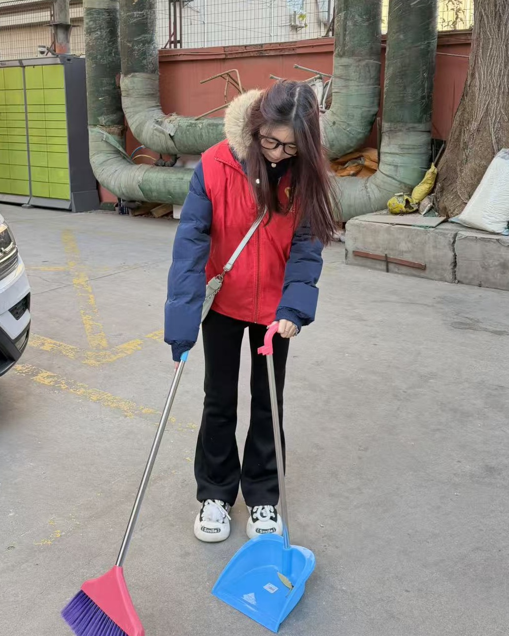 活动现场,围绕小区地面、停车场与楼道等核心清洁区域,志愿者们分工明确、协作默契,以高效务实的作风推进清扫工作。他们仔细清扫落叶与路面杂物,不放过任何一处卫生死角;俯身弯腰清理砖石缝隙中的垃圾;主动与小区车主沟通,引导车辆规范停放,助力维护交通秩序。经过数小时的辛勤劳动,社区环境面貌焕然一新。研究生志愿者们不怕脏、不怕累的奉献精神赢得了居民们的一致好评。